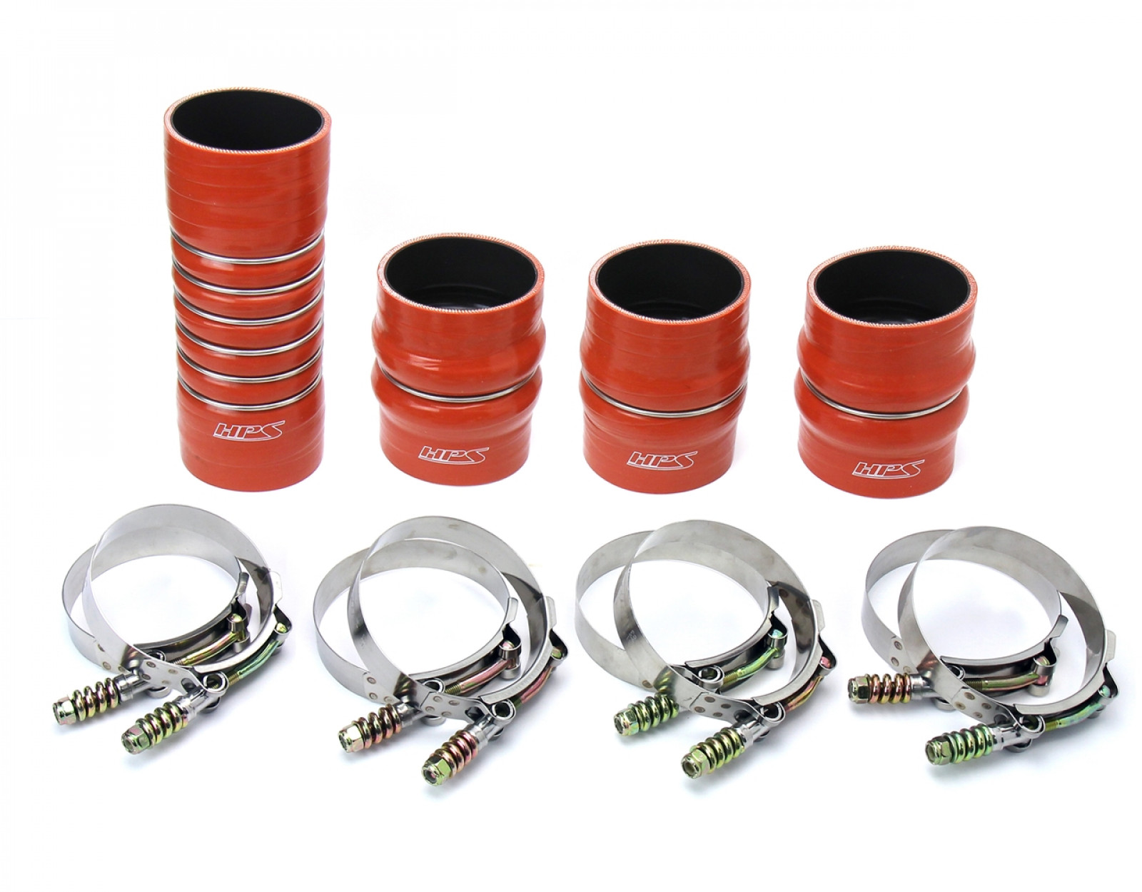HPS Aramid Reinforced Fluorolined Silicone Intercooler Hose Boot Kit with Spring loaded t-bolt clamps. Fits Dodge 2003-2007 Ram Pickup 5.9L Cummins Diesel. Race proven design combines with heat and oil resistent high temp silicone, designed to withstand over 100 PSI of boost and ensure the long lasting quality. Performance upgrade for the OEM CAC hoses. Race proven design . Includes HPS heavy duty spring loaded stainless steel T-bolt Clamps.